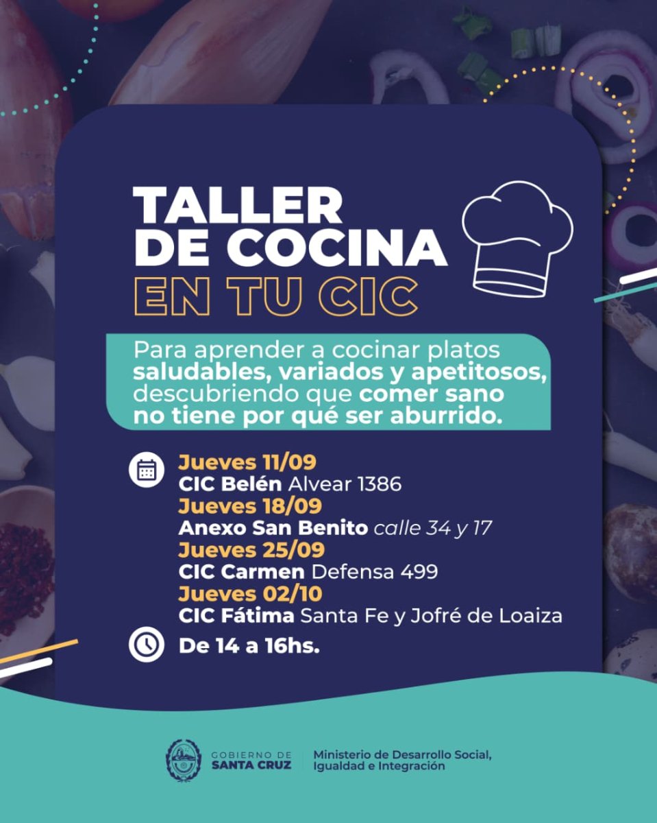 El Ministerio de Desarrollo Social, Igualdad e Integración invita a la comunidad a participar de los talleres de cocina saludable, una iniciativa impulsada por la Subsecretaría de Políticas Alimentarias, que busca fomentar hábitos de alimentación equilibrados, accesibles y prácticos, a través de encuentros participativos en los Centros Integradores Comunitarios (CIC) de Río Gallegos.