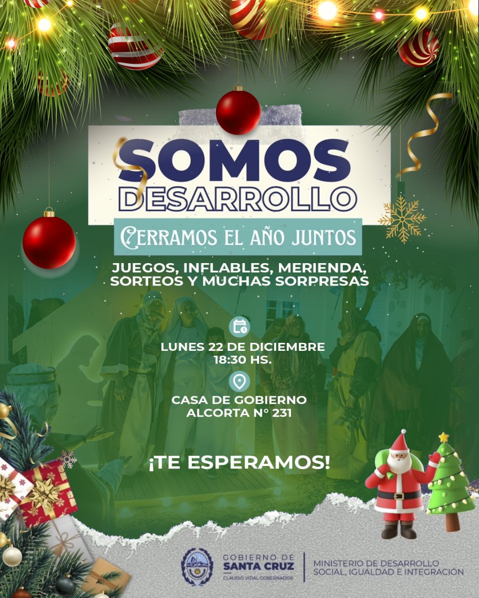 El Ministerio de Desarrollo Social, Igualdad e Integración informa que la jornada recreativa “Somos Desarrollo: Cerramos el año juntos” fue reprogramada para mañana, lunes 22 de diciembre a las 18:30 horas, y se llevará a cabo en Casa de Gobierno, en la ciudad de Río Gallegos.