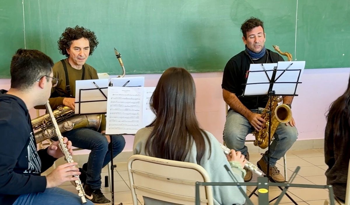 Látigo, Loosi, Garófalo y Manu, integrantes de la mítica banda de rock La Renga, brindaron una master class de vientos a los estudiantes de la Banda Sinfónica en la sede de El Calafate, de la Escuela Provincial de Música Re Si.