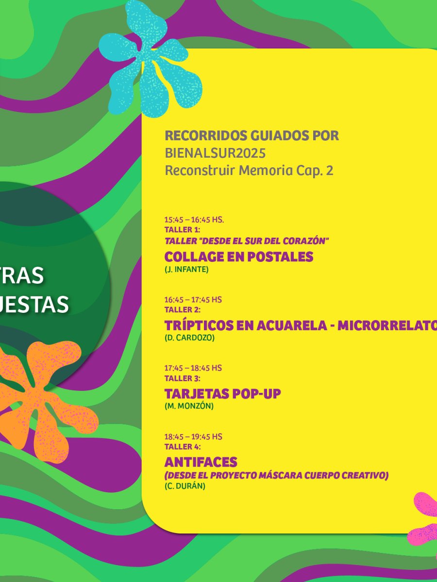 En esta edición se llevarán a cabo Talleres de Arte Express, breves experiencias de experimentación creativa, coordinadas por artistas invitados y docentes. Con un enfoque lúdico y accesible, los talleres invitan a celebrar la primavera como metáfora de florecimiento cultural.