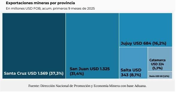 Según el informe, en septiembre de 2025 las exportaciones mineras argentinas totalizaron USD 557 millones (+34,3% interanual) y, en ese marco, Santa Cruz alcanzó USD 226 millones en ventas mineras durante el mes, el más alto registrado para septiembre en la provincia.