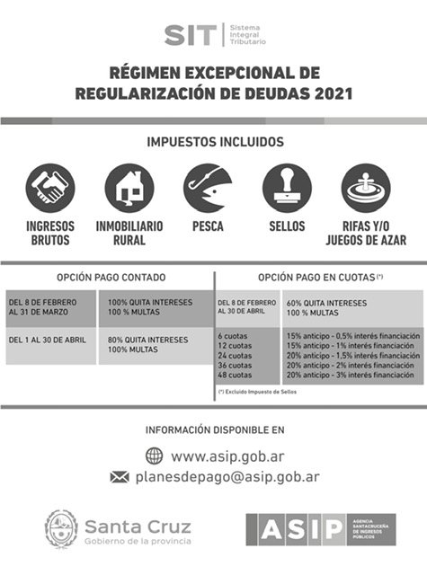 Con el objetivo de estimular el cumplimiento de las obligaciones fiscales cuya recaudación, fiscalización y determinación se encuentra a cargo de la ASIP, el organismo fiscal de la Provincia lanzará en el mes de febrero un Régimen Excepcional de Regularización de Deuda con condonación de intereses resarcitorios, punitorios y de las multas previstas en los arts. 53, 55, 56 y 60 del Código Fiscal.