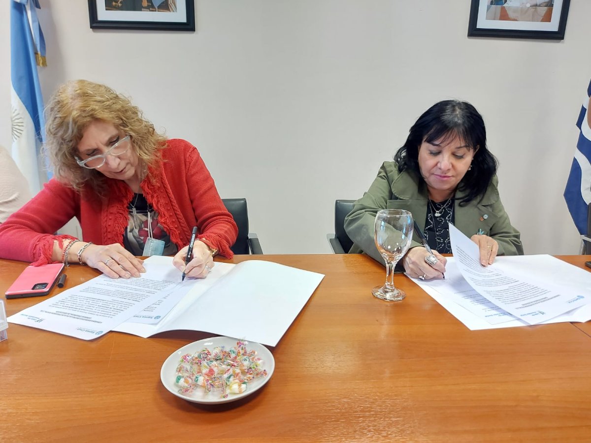 La presidenta de la institución previsional, Silvia Bande, y la titular del CPE, Cecilia Velázquez, rubricaron este jueves el convenio específico de pasantías en las instalaciones de la Caja de Previsión Social, en Río Gallegos.