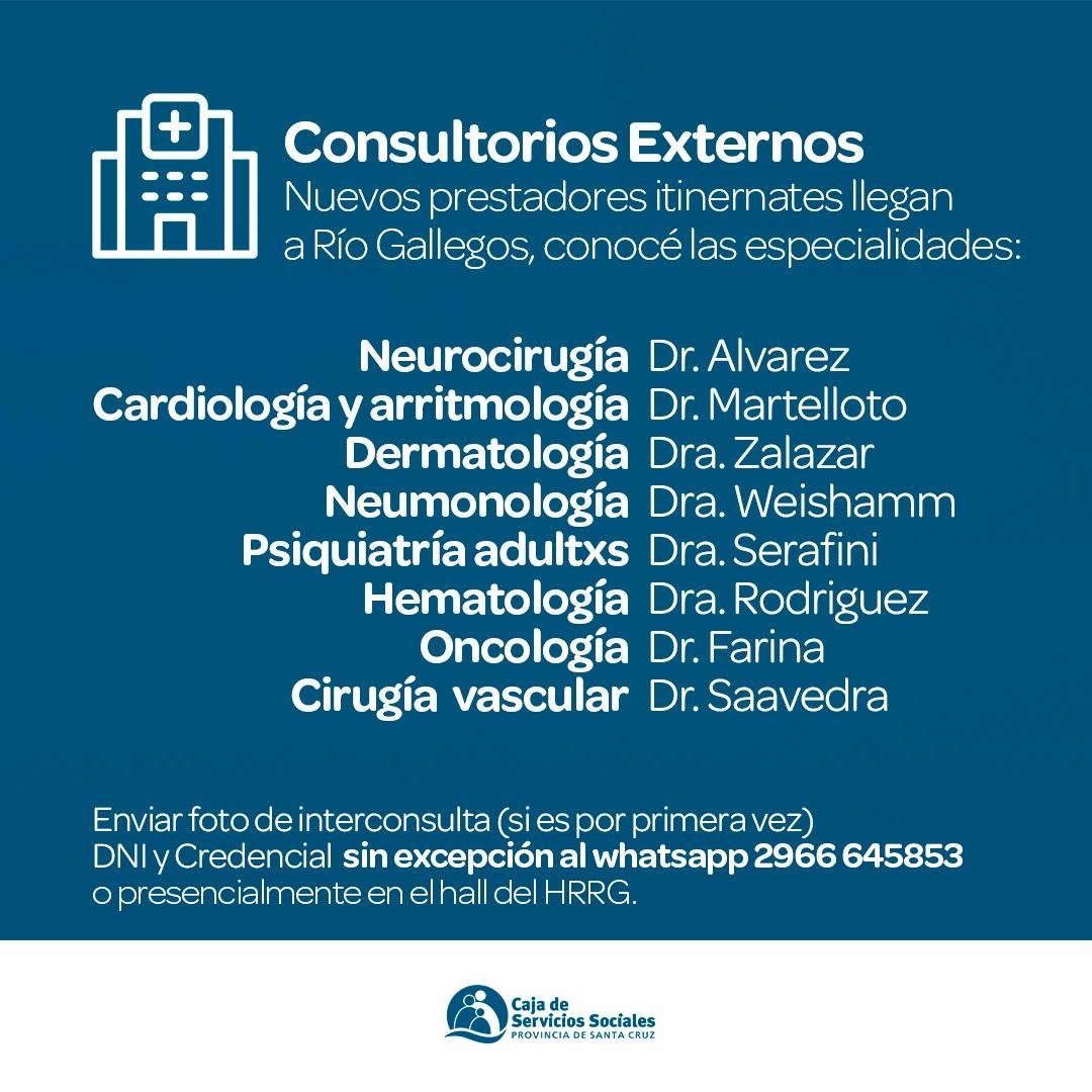 Las y los profesionales brindarán atención sin copago en el Hospital Regional Río Gallegos. Los turnos se pueden solicitar de manera presencial en el hall del HRRG o por WhatsApp a través del 2966 64-5853, en ambos casos los requisitos incluyen presentar la credencial de la obra social y un pedido de interconsulta. Esta solicitud puede ser a puño y letra escrito por el profesional tratante o de cabecera, debe indicar con qué especialidad se requiere atención. En caso de residir en localidades del interior, el trámite tiene los mismos pasos por medio de la delegación.