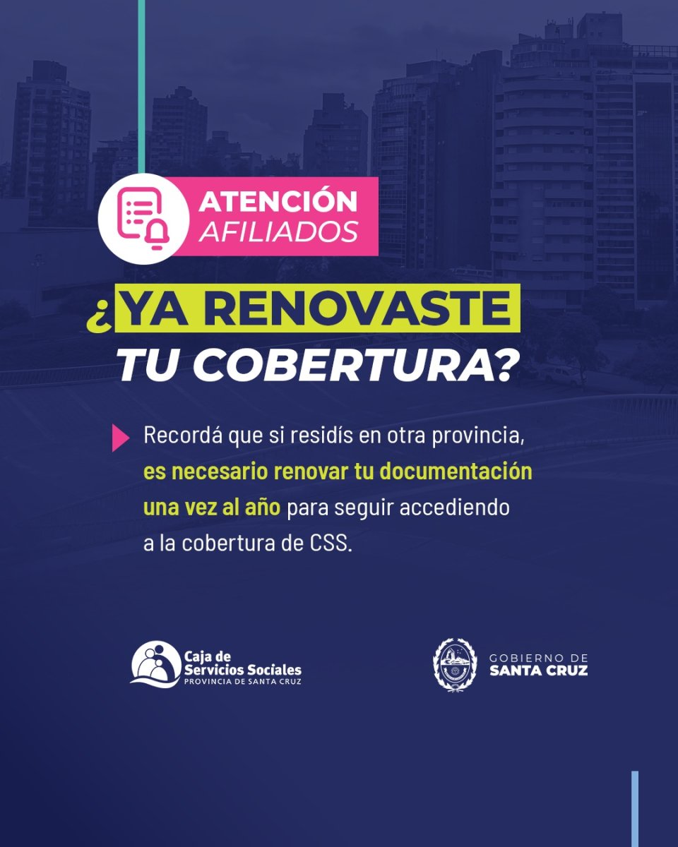 La Caja Servicios Sociales (CSS) de la Provincia de Santa Cruz reitera a los afiliados pasivos que residen fuera de Santa Cruz, deben renovar su documentación una vez al año.