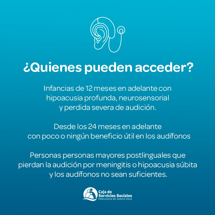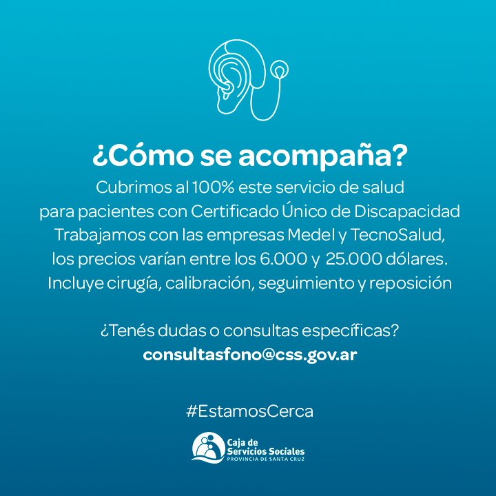 La Caja de Servicios Sociales de Santa Cruz cubre al 100% este servicio para pacientes con Certificado Único de Discapacidad. Desde la obra social santacruceña se trabaja con las empresas Medel y TecnoSalud y los valores de los implantes cocleares oscilan entre los 6000 y 25000 dólares. El servicio incluye la cirugía para la adquisición del procesador y a medida que pasa el tiempo, controles y reposiciones.