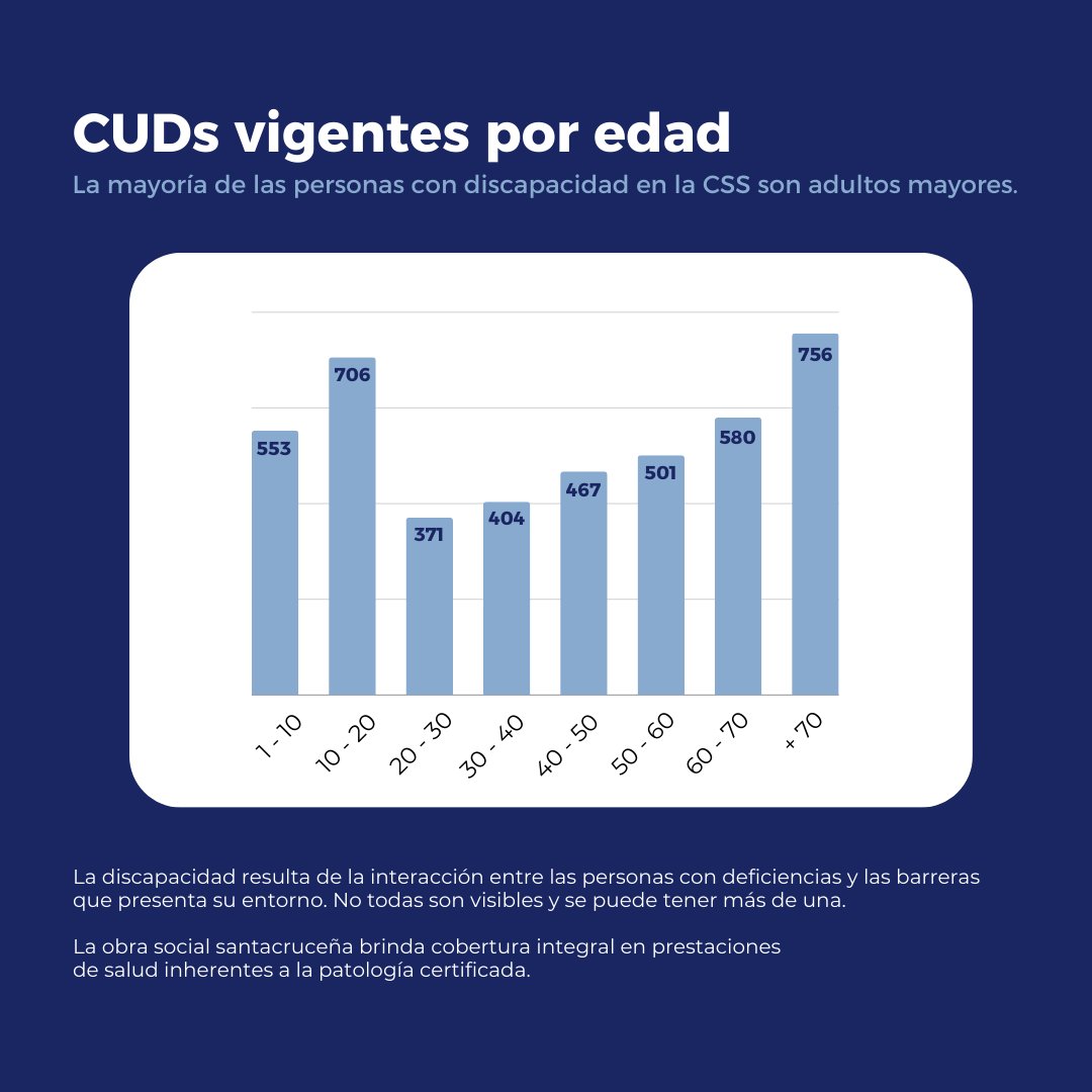 En materia de grupos etarios, el mayor porcentaje lo ocupan personas mayores de 70 años, sumando 756 afiliados. El segundo lugar más numeroso con 706 pacientes es de niños, niñas y adolescentes de 10 a 20 años y el tercero con 553, infancias de 1 a 10 años. La lista continua con pacientes de 40 a 50 años con 467 afiliados registrados, en penúltimo lugar, con 404 personas con CUD, se encuentra la franja de 30 a 40 años y el último con 371 de 20 a 30 años.