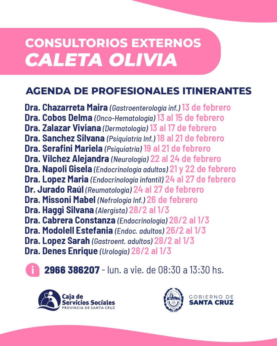 El Gobierno de Santa Cruz, a través de la Caja de Servicios Sociales (CSS), informa a sus afiliadas y afiliados de Zona Norte la agenda confirmada de Consultorios Externos para el mes de febrero 2026, con el objetivo de garantizar el acceso a especialidades en el territorio y fortalecer la atención programada. La atención será brindada en los hospitales de Caleta Olivia y Las Heras.