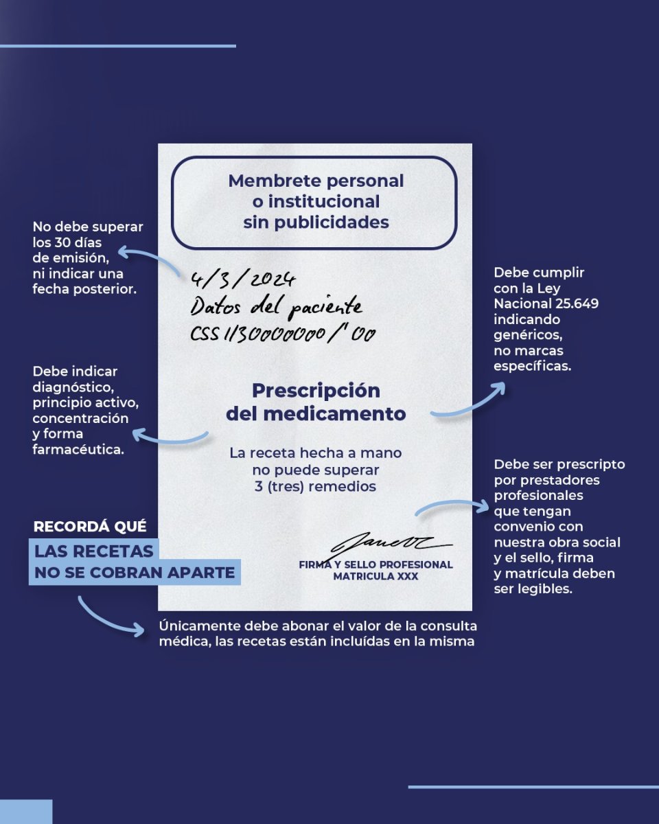 -No se pueden recetar marcas, en cumplimiento de la Ley Nacional 25649, se deben prescribir genéricos, es decir, las drogas, no laboratorios o marcas específicas. Deben estar a nombre de quien vaya a consumir la medicación, son personales e intransferibles.