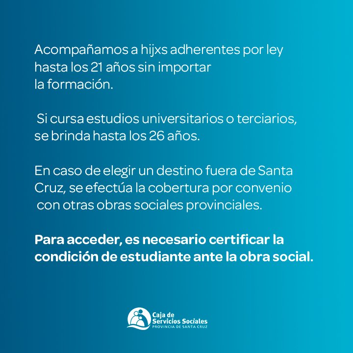 La obra social santacruceña brinda cobertura hasta los 21 años, por ley, sin importar si el afiliado o la afiliada realiza este tipo de formación. Si él o la adherente cursa estudios universitarios o terciarios, certificándolo, se brinda hasta los 26 años inclusive. En caso de elegir un destino fuera de Santa Cruz, se efectúa la cobertura por convenio interprovincial con otras obras sociales provinciales.