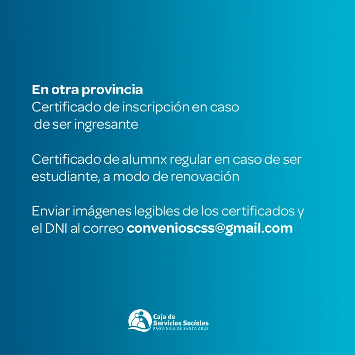 El Gobierno de Santa Cruz, a través de la Caja de Servicios Sociales, informó las vías remotas y ágiles para realizar el trámite y acceder a la cobertura para estudiantes universitarios dentro y fuera de la provincia.