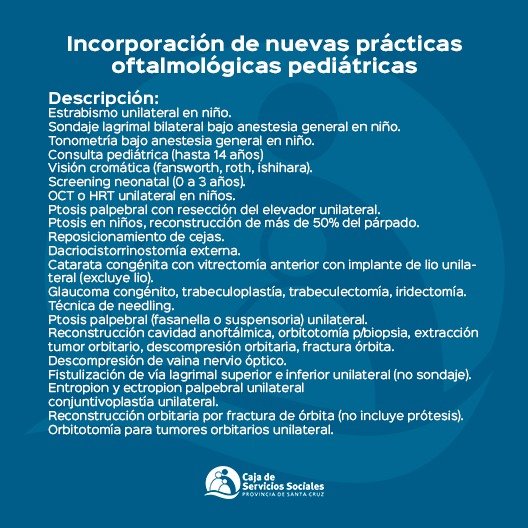 Las y los afiliados pueden solicitar su turno a través del WhatsApp 2966 - 767659 y conocer la novedosa amplitud de prácticas que cubre la obra social de la provincia de Santa Cruz en oftalmología pediátrica en este centro de ojos. Estos incluyen desde la reconstrucción orbitraria por fractura, hasta el tratamiento de glaucomas congénitos iridectomía y técnica de needling.