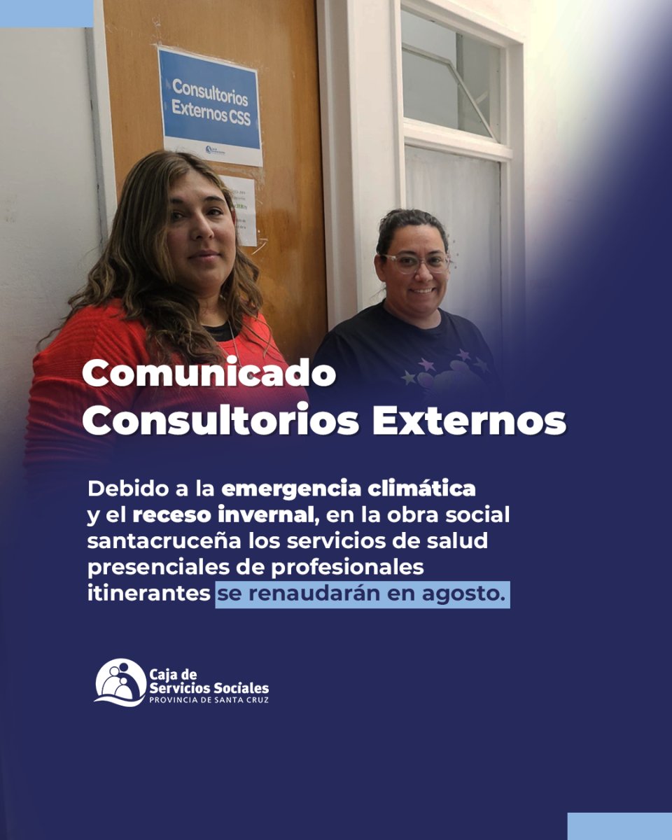 El servicio de Consultorios Externos en la Caja de Servicios Sociales, Provincia de Santa Cruz, brinda especialidades en localidades de residencia a pacientes de ciudades como Río Gallegos, Río Turbio, El Calafate, Caleta Olivia y Las Heras. Los turnos presenciales se encuentran suspendidos y se reanudarán en agosto. Se coordinarán teleconsultas en los casos que sea necesario. Las derivaciones que no revistan carácter urgente también se realizarán a partir de agosto.