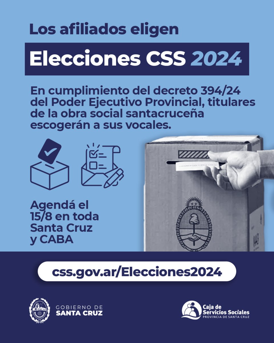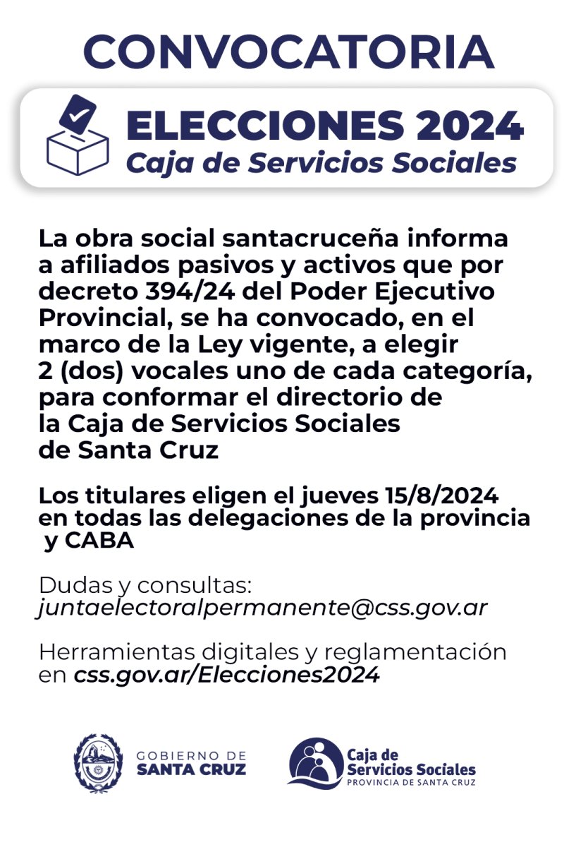 El próximo 15 de agosto se elegirán dos nuevos vocales para integrar el directorio de la obra social santacruceña, uno por categoría pasiva y otro por la activa. Titulares de toda Santa Cruz y la Ciudad Autónoma de Buenos Aires, podrán votar por su candidato en el órgano representativo de la Caja de Servicios Sociales.