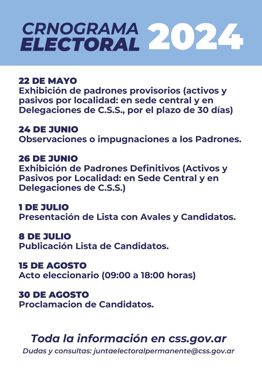 Como primer paso, la Caja de Servicios Sociales habilitó los padrones provisorios, que se encuentran en todas las sedes de manera impresa y en un buscador digital de fácil acceso como es css.gov.ar/Elecciones2024. Hasta el 24 de junio hay tiempo para realizar observaciones e impugnaciones de dichos padrones provisorios a través del correo juntaelectoralpermanente@css.gov.ar. De ese modo, se podrá definir el padrón definitivo.