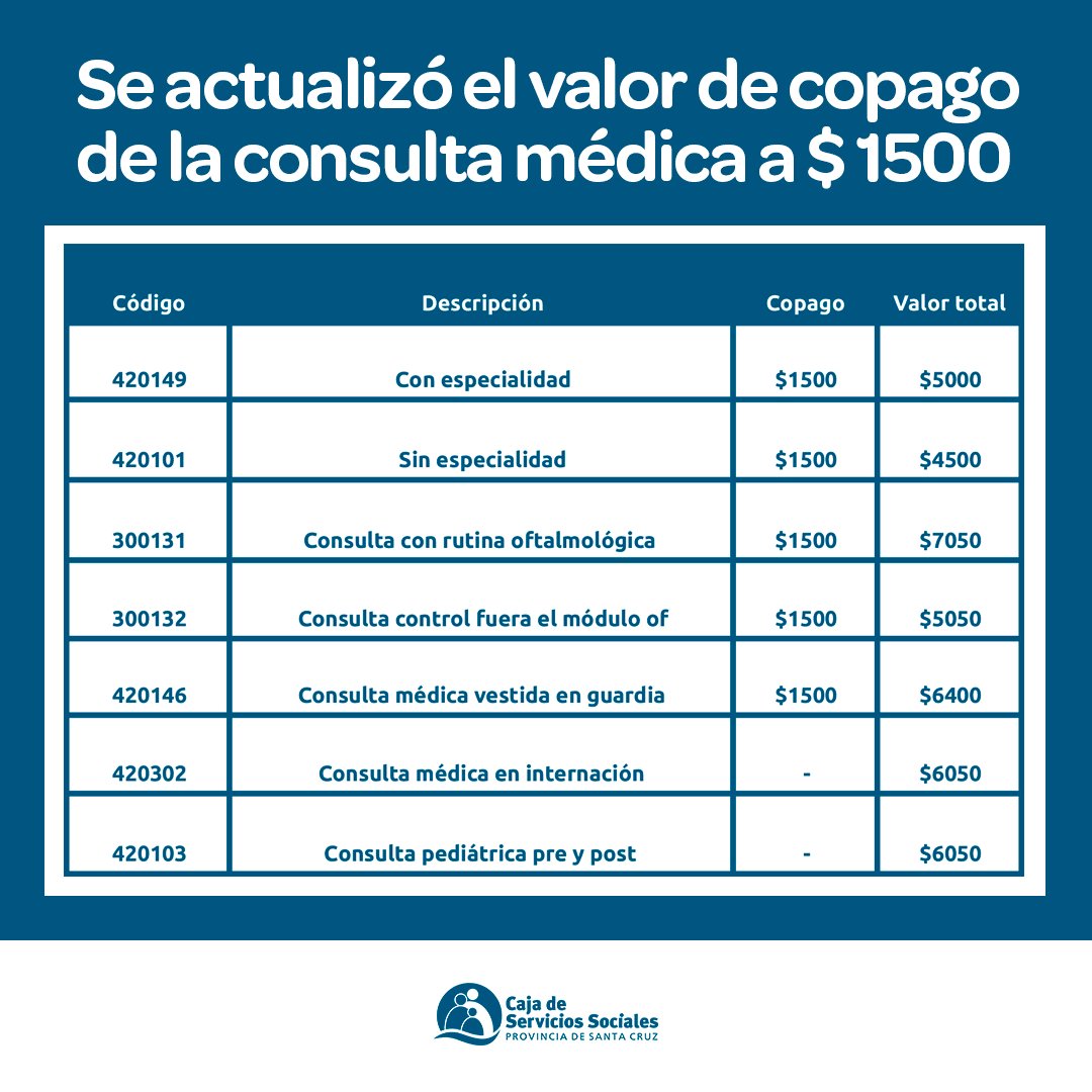 El Gobierno de Santa Cruz, a través de la obra social de las y los trabajadores del Estado, informó sobre la actualización del copago vigente desde el 1° de diciembre del 2023, para consultas médicas con y sin especialidad, en todo el territorio provincial con la Caja de Servicios Sociales.