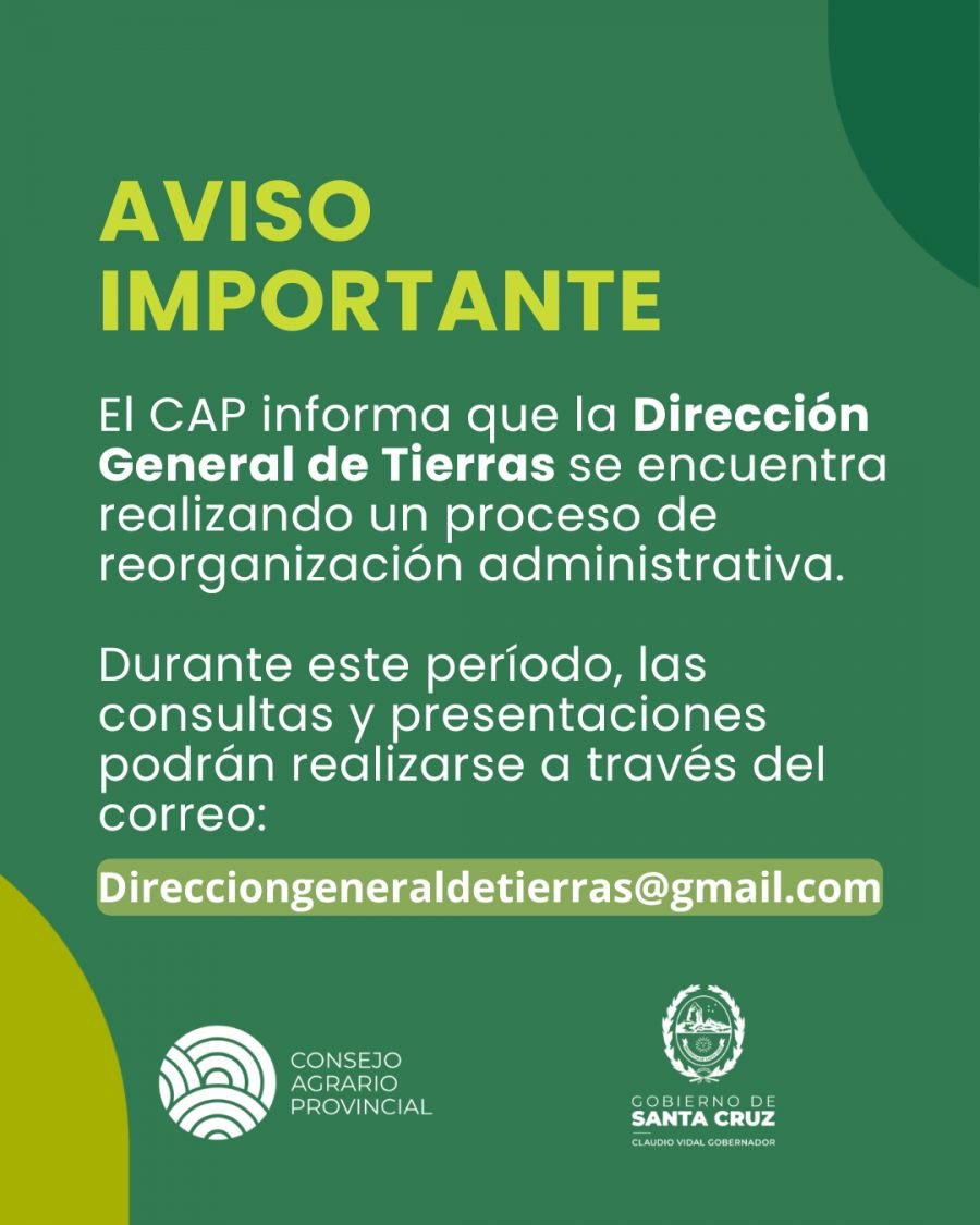 El Consejo Agrario Provincial (CAP) informó que la Dirección General de Tierras de la Provincia de Santa Cruz iniciará un proceso de reorganización interna orientado a optimizar su funcionamiento y mejorar la calidad del servicio que se brinda a la comunidad.