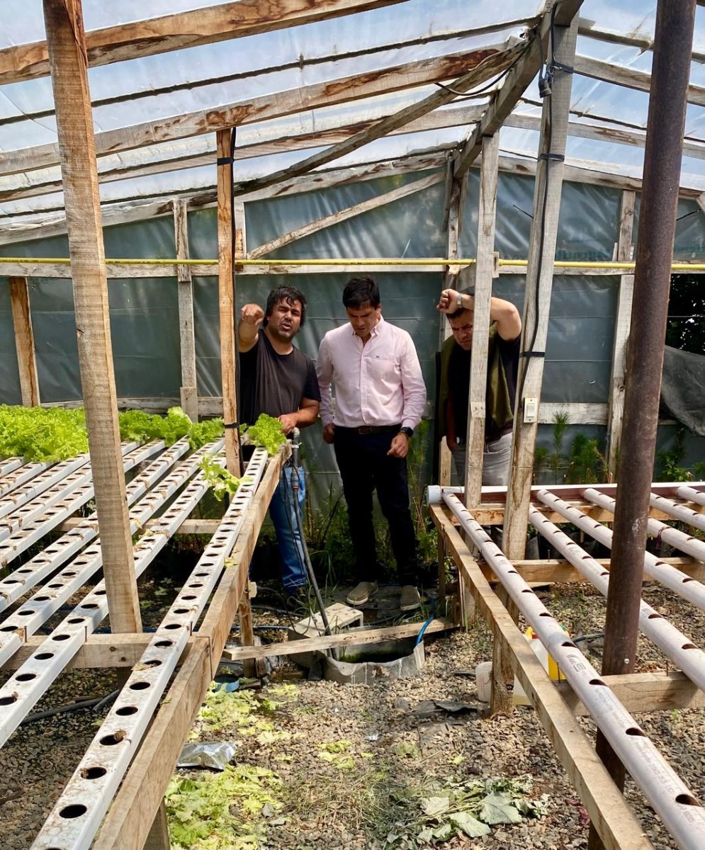 Hugo Garay estuvo en el emprendimiento que integra producción de huevos a escala, pollos parrilleros, frutillas, hortalizas de hoja en sistema hidropónico y en suelo, ajos, además de plantas ornamentales y flores, entre otras actividades que diversifican la oferta local de alimentos.