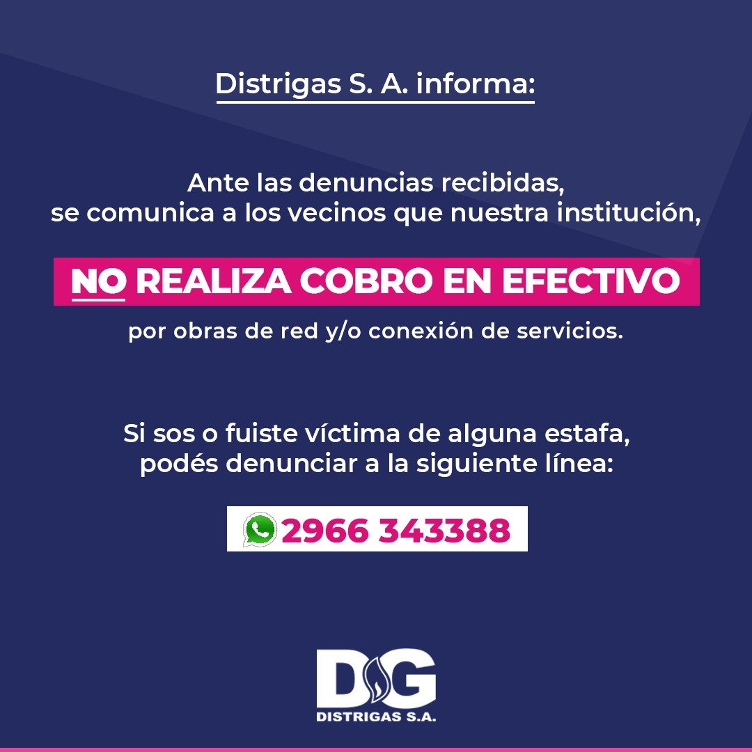 Se subraya que Distrigas S.A. (DG) “no realiza cobro en efectivo por obras de red y/o conexión de servicios”.