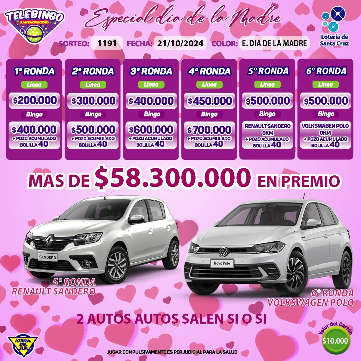 El Gobierno de Santa Cruz, a través de la Lotería para Obras de Acción Social (LOAS) dependiente del Ministerio de Desarrollo Social, Igualdad e Integración, informa que a partir del lunes 21 de octubre se sortea el Telebingo Especial Día de la Madre.