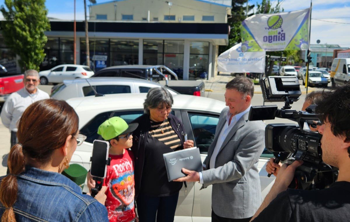 Lotería de Santa Cruz entregó este martes el premio a Elba, mamá de Caleta Olivia, ganadora del Volkswagen Polo Track 0 km en el Telebingo Santacruceño Día de la Madre. La jubilada, fiel seguidora del juego familiar desde sus inicios, fue recibida por Juan Maier, presidente de Lotería de Santa Cruz, quien le entregó las llaves y documentos del auto.