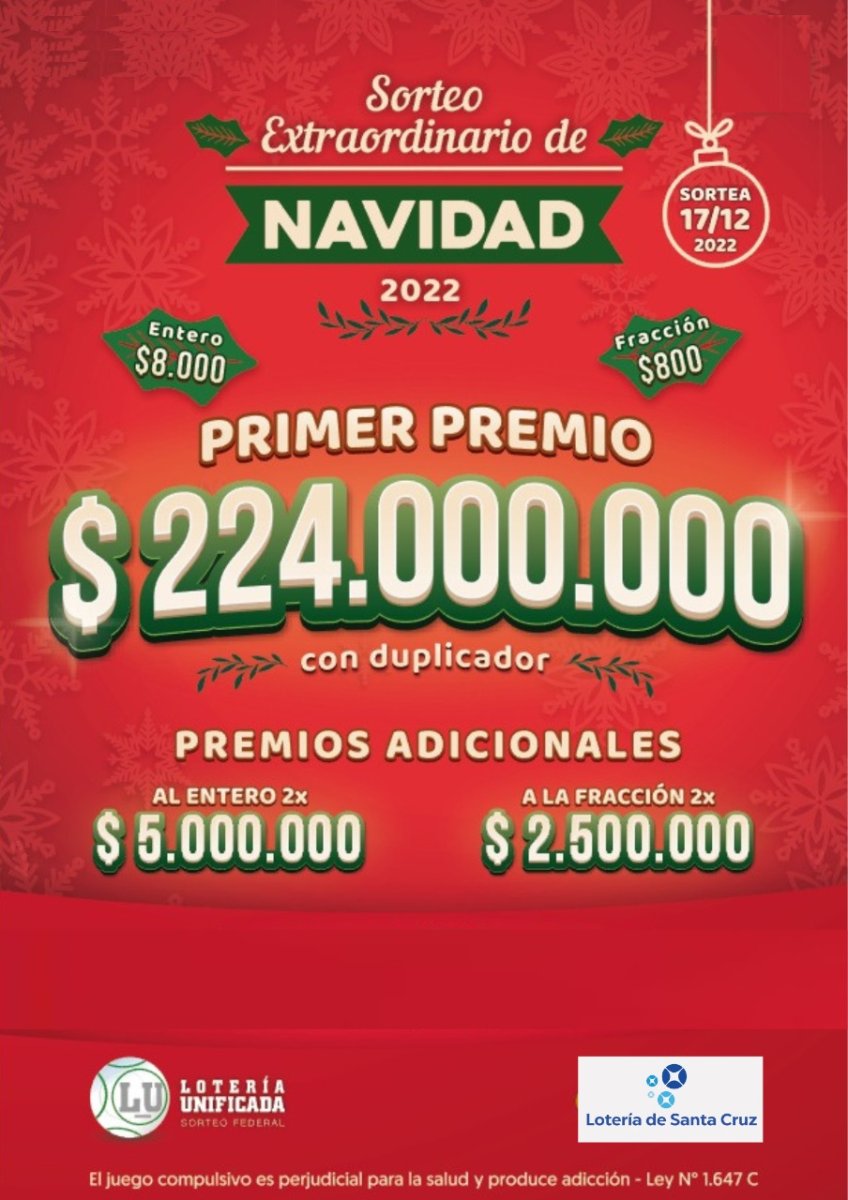 El sábado 17 de diciembre se realizará el primero de los sorteos que pondrá en juego un premio de 224 millones de pesos con duplicador, dos premios de 5.000.000 de pesos como adicionales por la compra del entero, y otros dos premios de 2.500.000 pesos a la compra de la fracción.