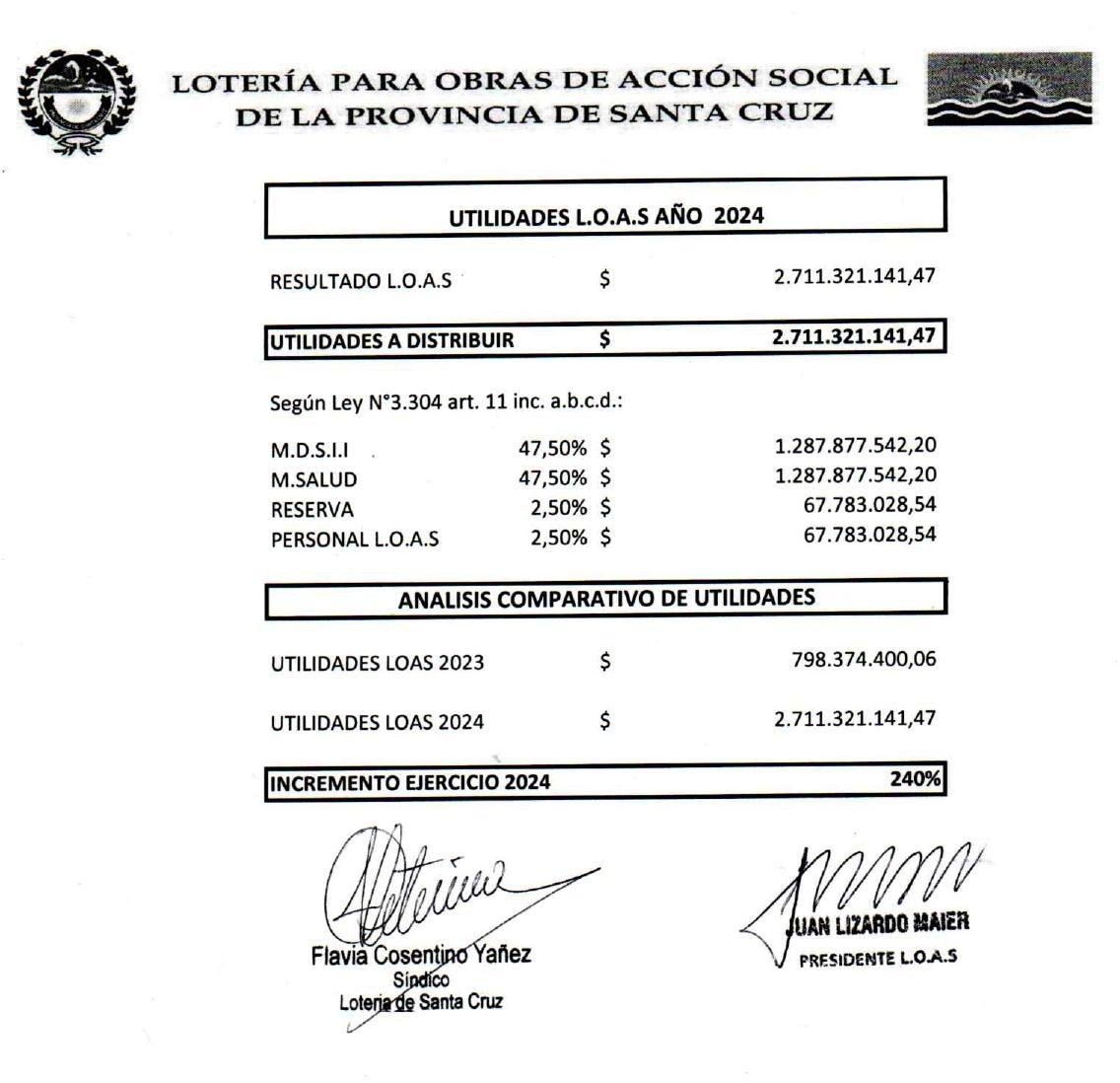 Dieron a conocer un informe sobre los resultados de la recaudación en Lotería para Obras de Acción Social. Tal es así que, bajo la presidencia de Juan Maier, Lotería de Santa Cruz alcanzó una recaudación histórica sobre el año 2023.
