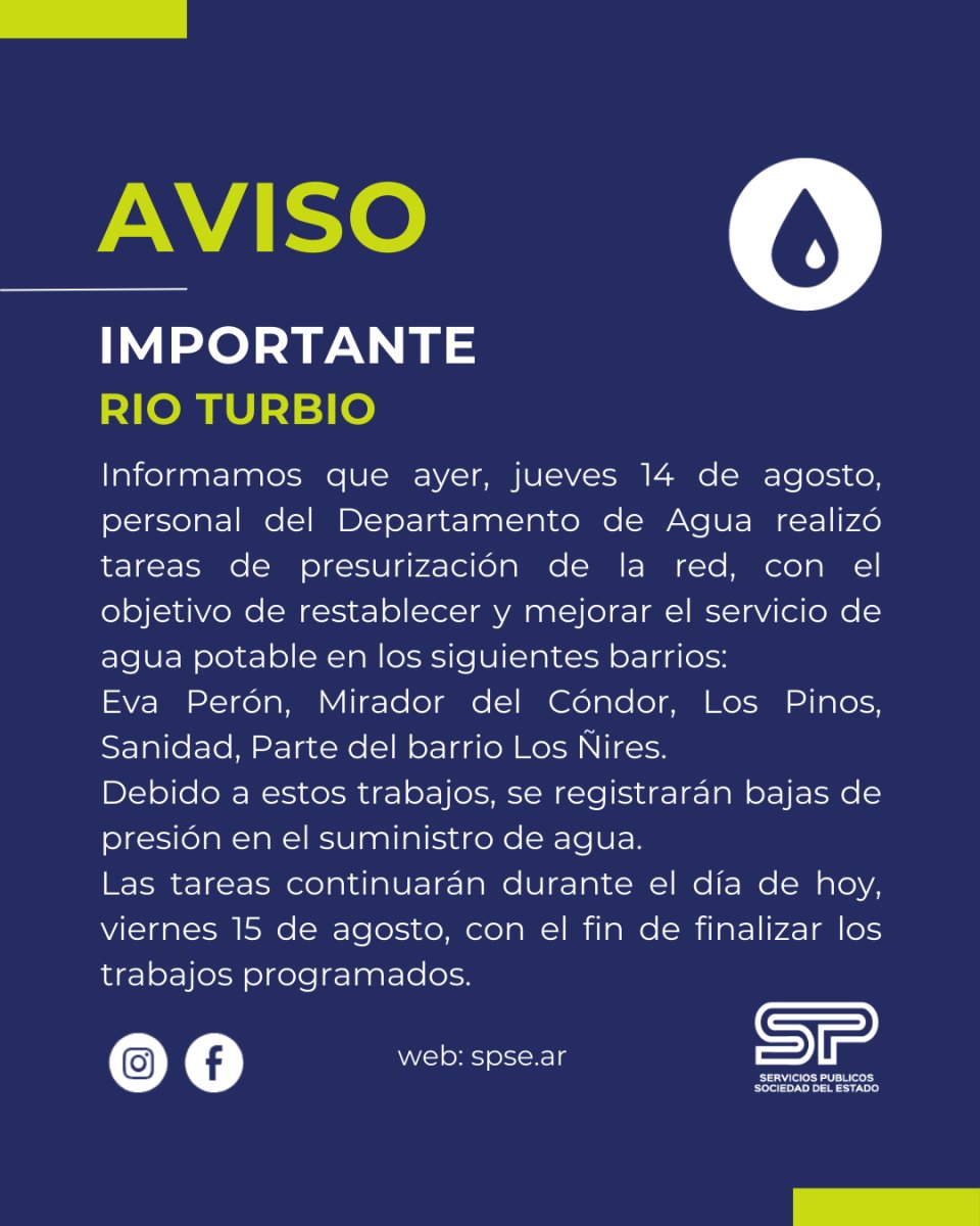 Debido a estos trabajos, podrían registrarse bajas de presión en el suministro en el día de hoy, viernes 15 de agosto, continuamos con las tareas para mejorar el servicio.