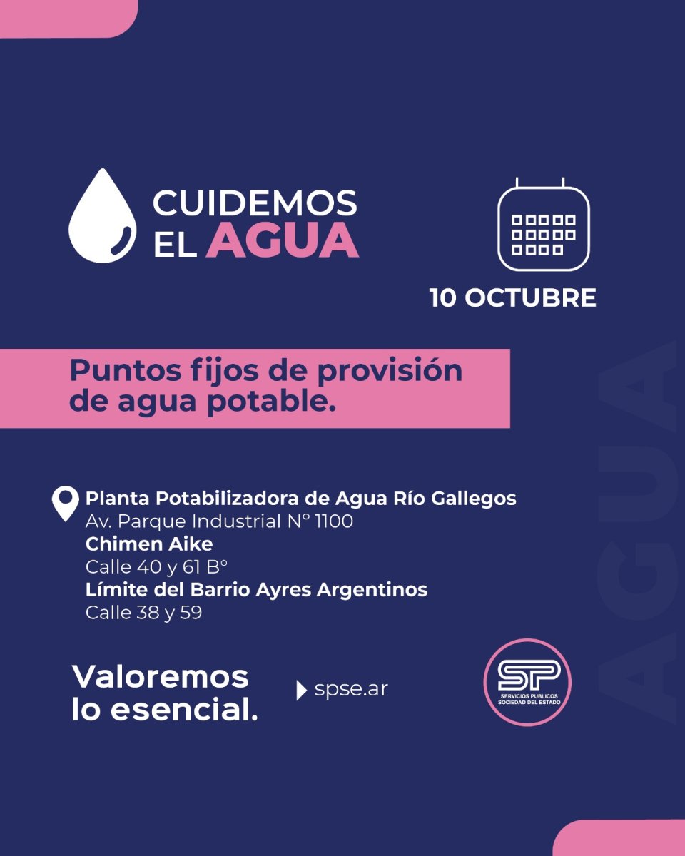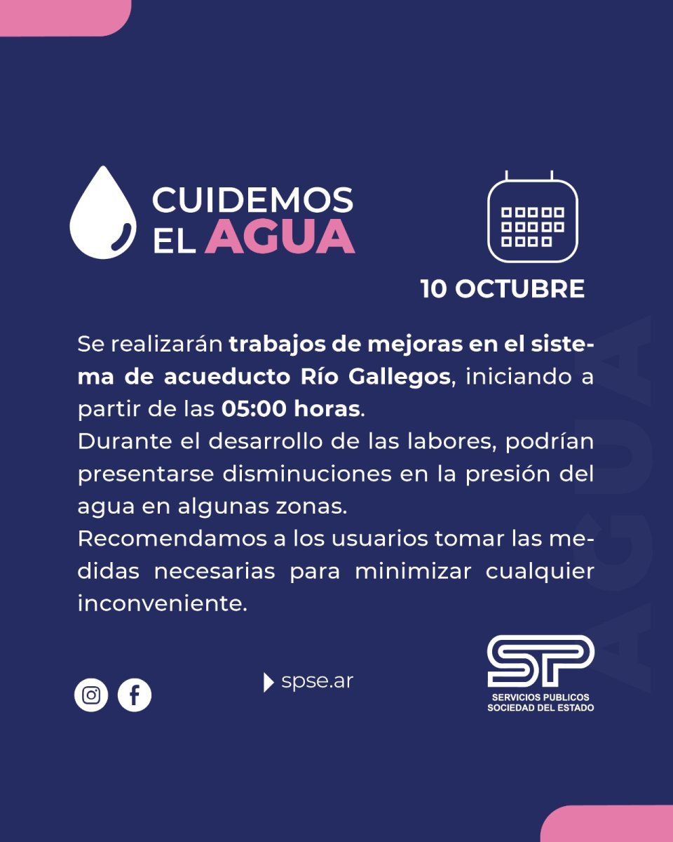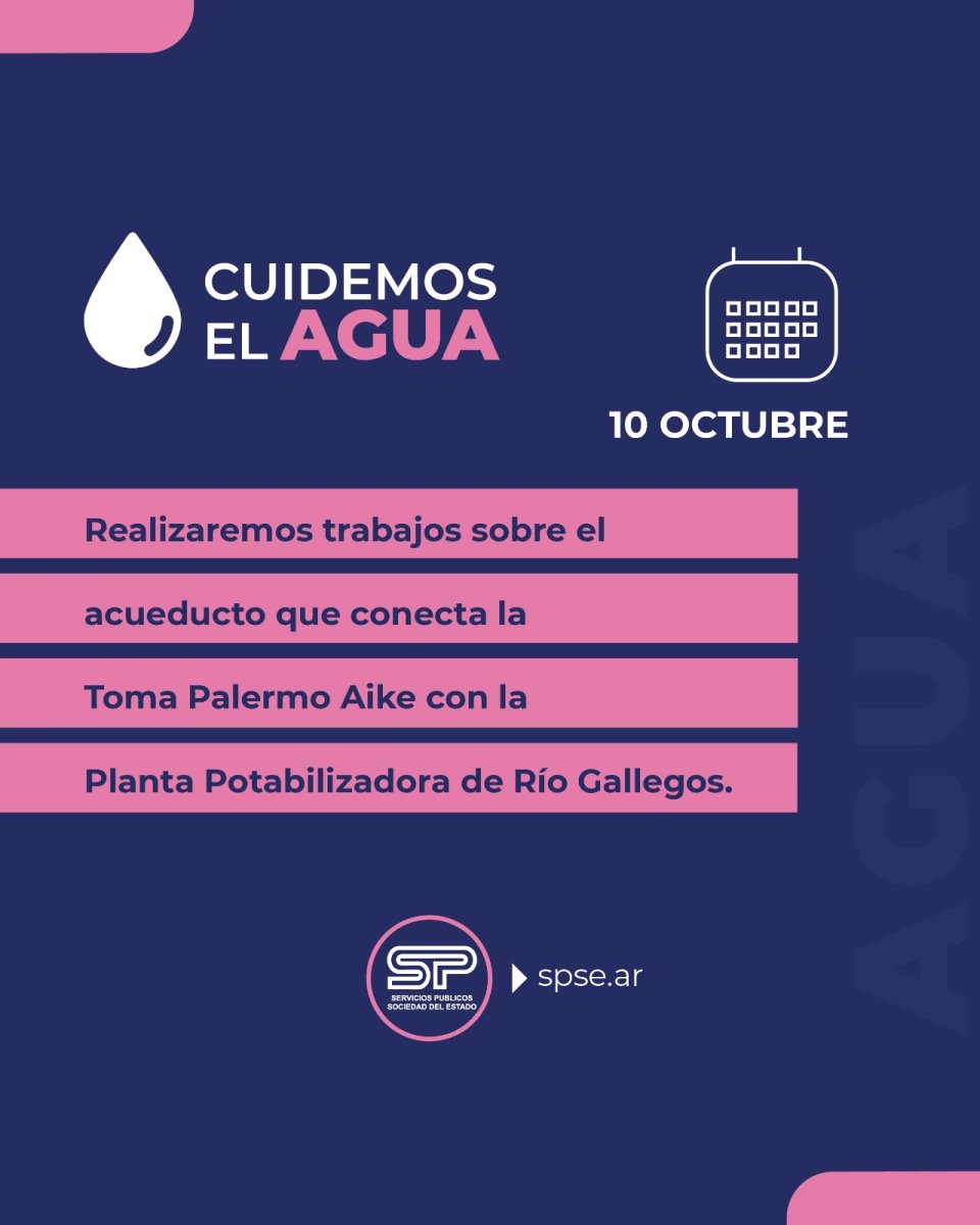 La empresa Servicios Públicos Sociedad del Estado (SPSE), informa que se llevarán a cabo trabajos de mejora en el acueducto que conecta la toma Palermo Aike con la Planta Potabilizadora de Río Gallegos. El objetivo de estos trabajos es mejorar el servicio hídrico en la localidad, optimizando el rendimiento y la presión del suministro. Estos trabajos se llevarán a cabo a partir de las 05:00hs del día viernes 10 de octubre.