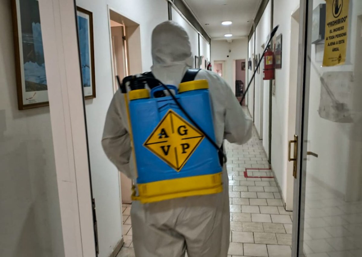 En el marco de las medidas adoptadas para afrontar el coronavirus, personal del área de Abordaje Territorial de la Administración General de Vialidad Provincial, a cargo de Gonzalo Mansilla, llevó a cabo la desinfección del edificio central del ente dependiente del Gobierno de Santa Cruz.