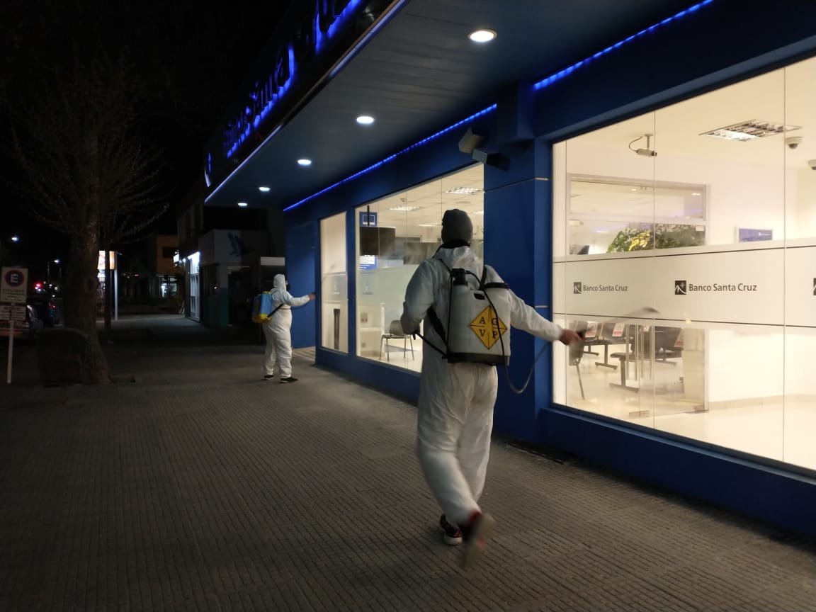 El personal de la institución se encargó de sanitizar veredas, ingresos y rampas de acceso a lugares como bancos, cajeros automáticos, sedes de ANSES y el Ministerio de Desarrollo Social, además de otros edificios públicos.