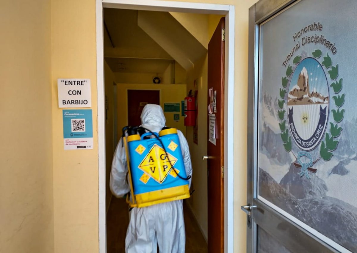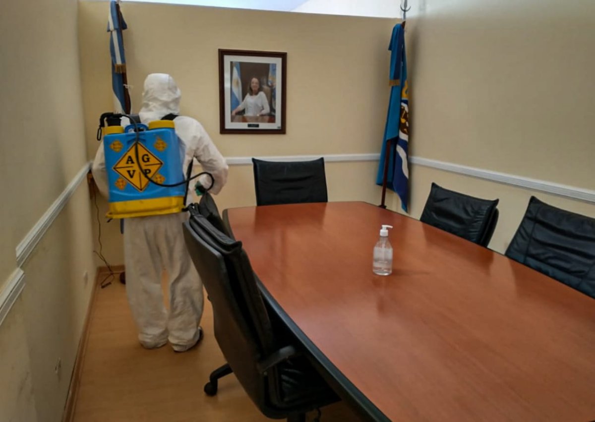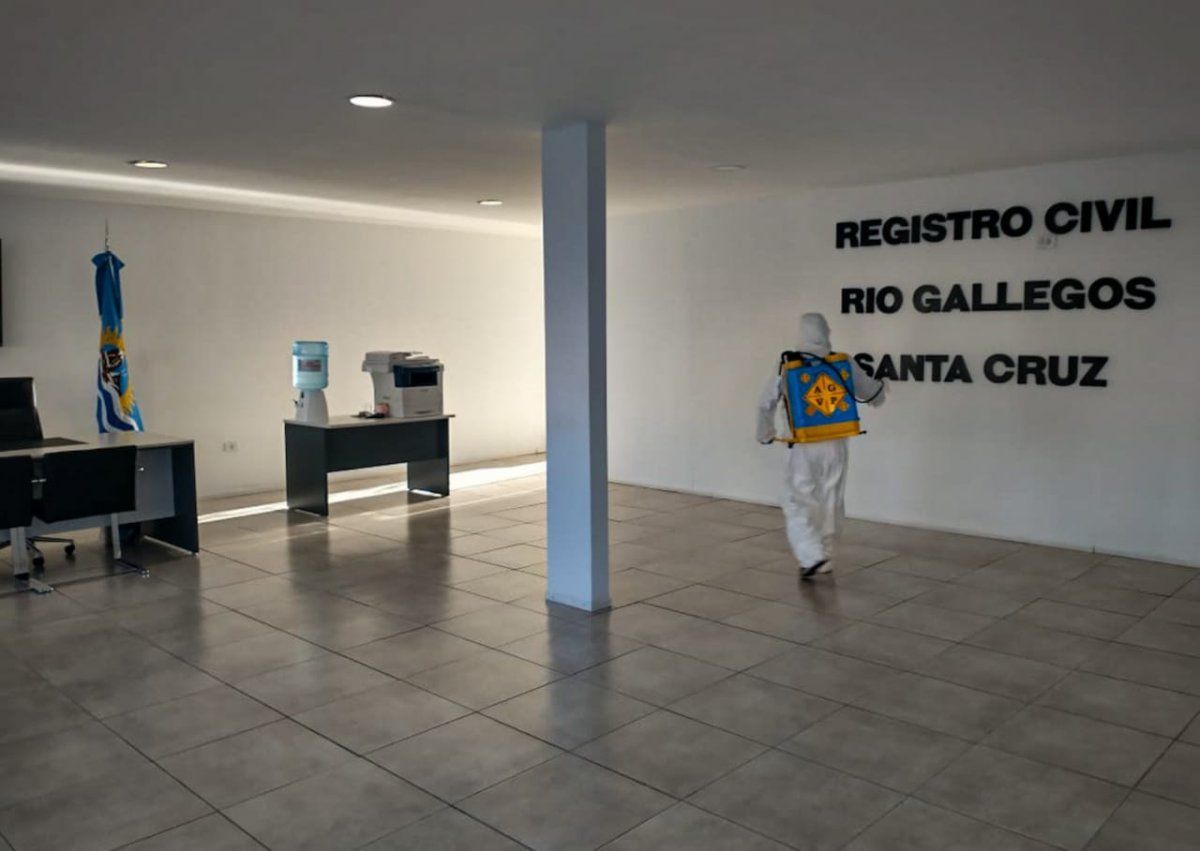 Desde Vialidad Provincial, a través del área de Abordaje Territorial a cargo de Gonzalo Mansilla, se llevó a cabo la desinfección de espacios públicos de Río Gallegos, tales como el Registro Civil, Registro de la Propiedad, el Tribunal Disciplinario, instalaciones del PAMI y el centro vacunatorio "Vacunar para Prevenir".