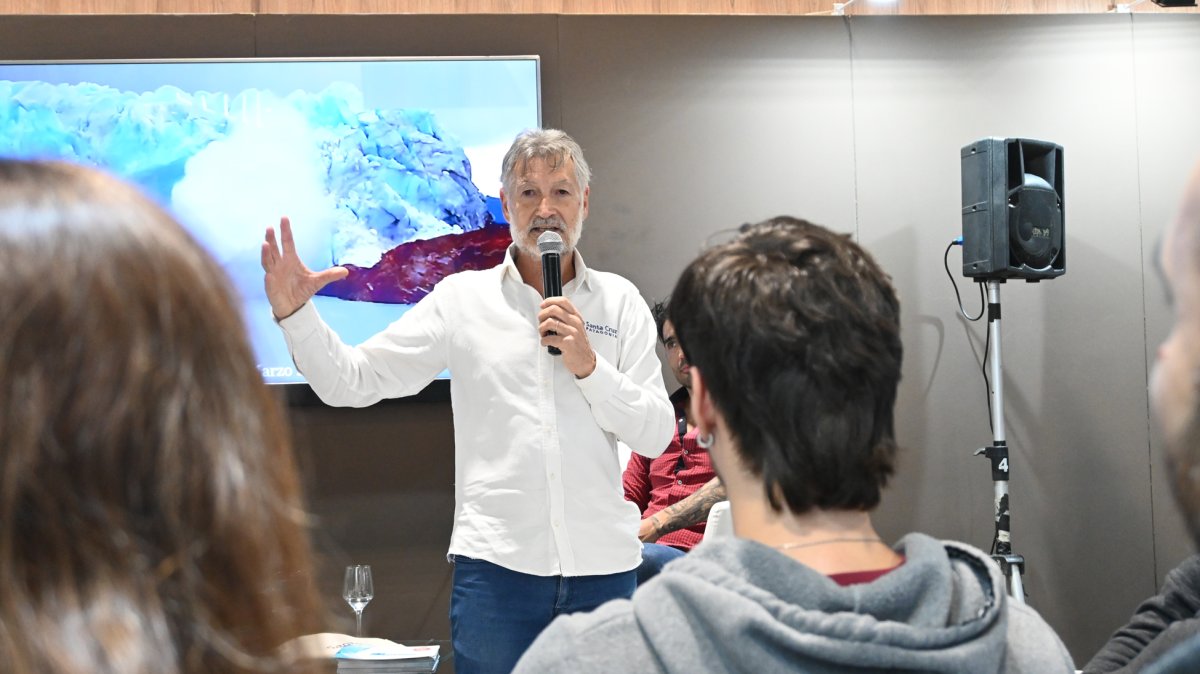 “El Glaciar Perito Moreno es una enorme masa de hielo que está activa, y lo que lo hace especial y único es su proceso de avance y retroceso”, relató Parengo ante la audiencia en la Feria Internacional del Libro 2023, en la Ciudad de Buenos Aires.