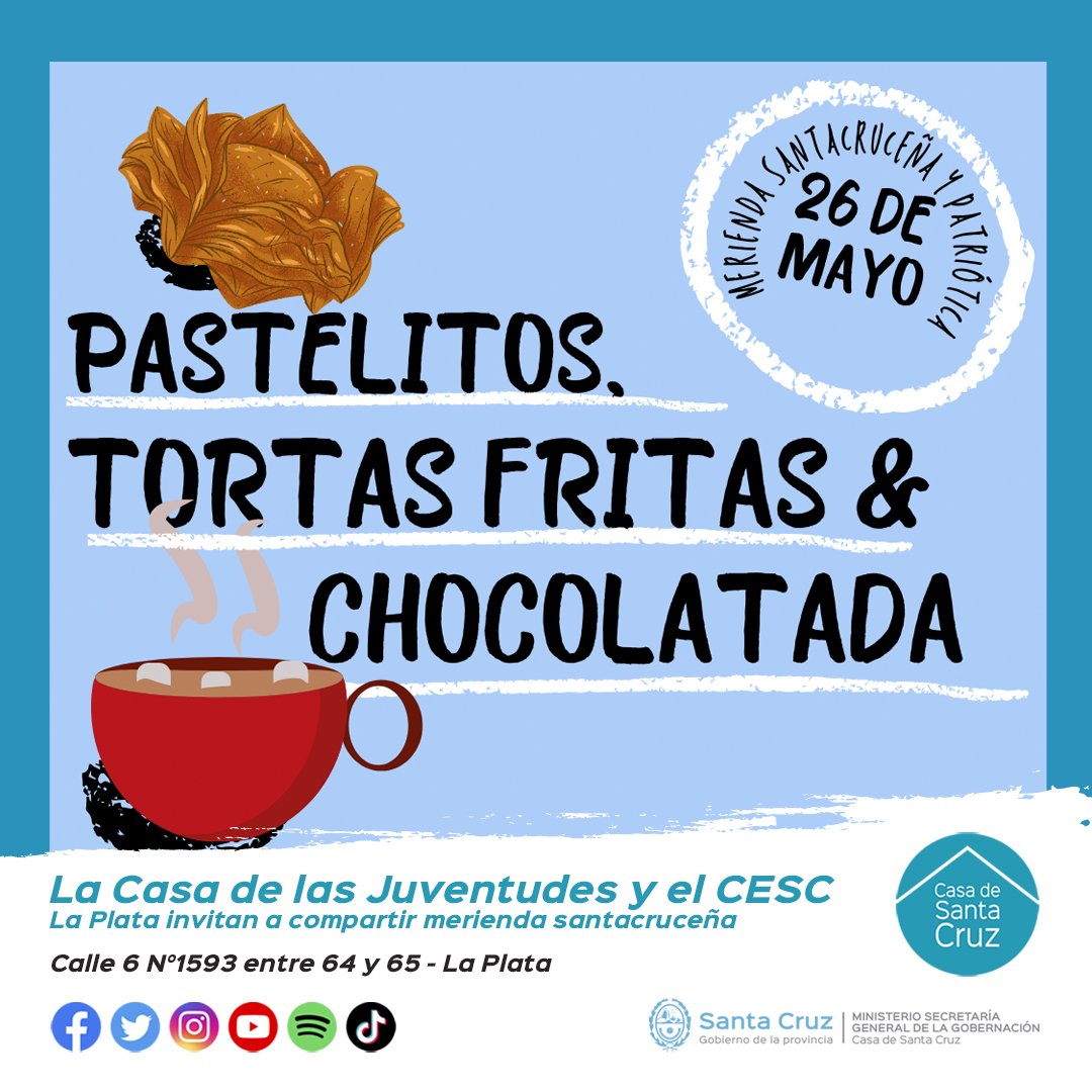 El propósito de la reunión es compartir una merienda patriótica con pastelitos, torta fritas y chocolatada junto al Centro de Estudiantes Santacruceñxs.