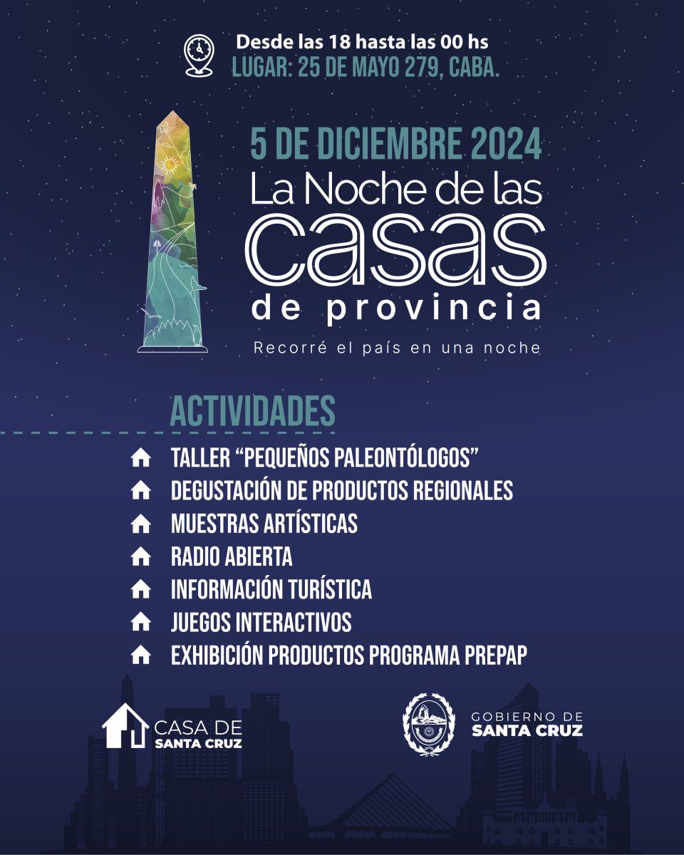 La Casa de Santa Cruz, estará presente el día 5 de diciembre, en la 11ª edición de “La Noche de las Casas de Provincia 2024”, así se podrá conocer y rememorar lo mejor de nuestra provincia en la capital argentina. Una noche única para celebrar la cultura, gastronomía, patrimonio y espíritu santacruceño.