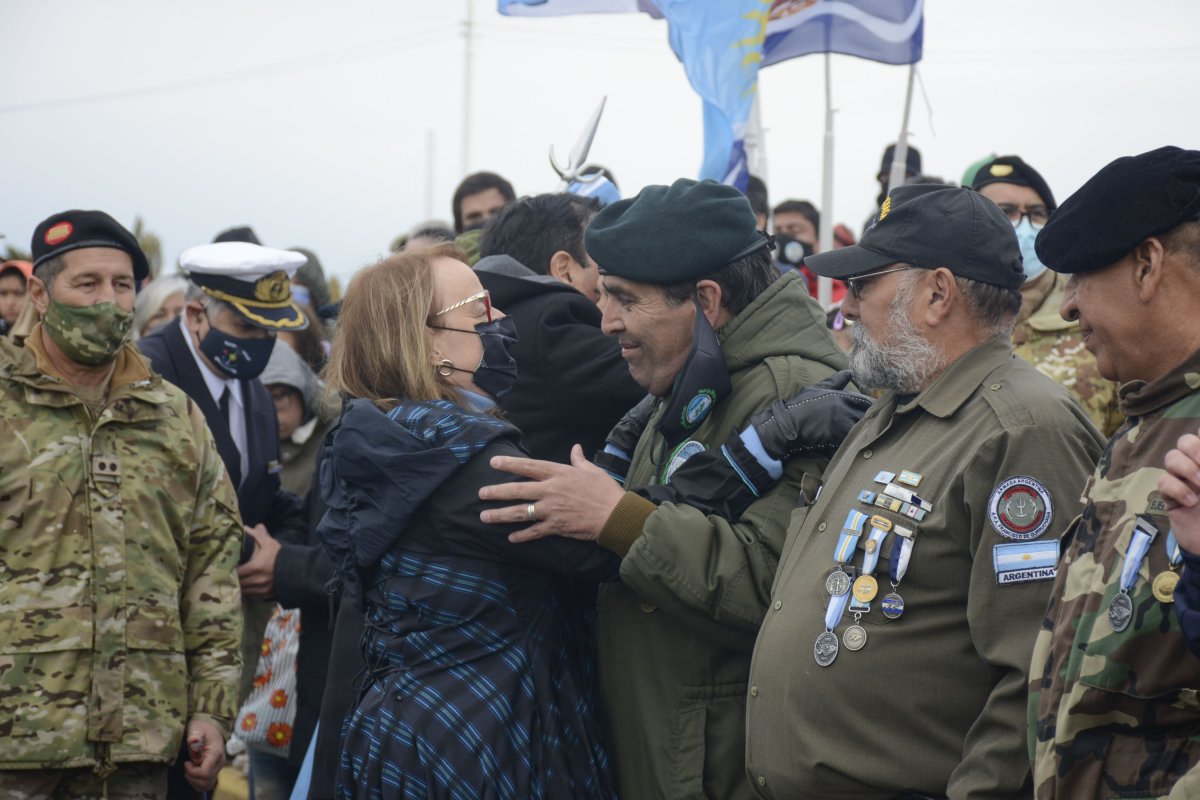 Luego de las palabras del veterano de guerra Fernando Alturria, de las del intendente Pablo Grasso, y del desfile de los estudiantes abanderados de las distintas instituciones educativas que asistieron portando la insignia patria, se procedió a dar lugar al saludo de la Gobernadora y el Intendente, de manera personal, seguidos por otros funcionarios, a los veteranos de guerra y a los padres del soldado José H. Ortega.