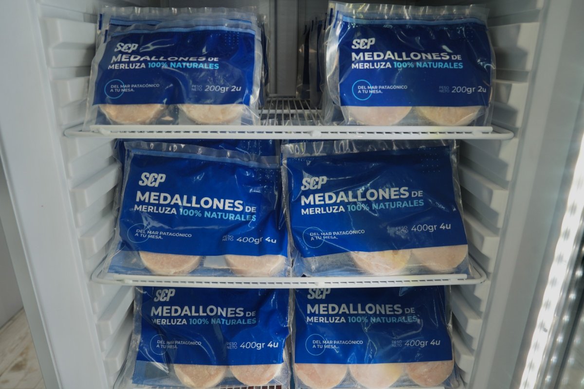 En estas heladeras se comercializan medallones de merluza, trucha, filé de merluza y otros productos de origen santacruceño, elaborados bajo estándares de calidad premium, sin agregados ni aditivos.