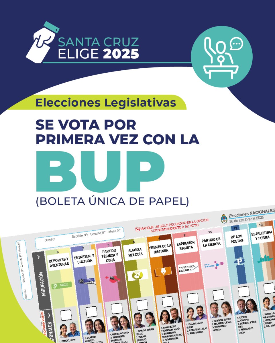 El próximo 26 de octubre se realizarán las Elecciones Legislativas en todo el país, las primeras en las que se utilizará la Boleta Única de Papel (BUP). Hoy te contamos qué se elegirá en la provincia de Santa Cruz, quiénes son los candidatos, cómo se votará y dónde consultar tu lugar de votación.