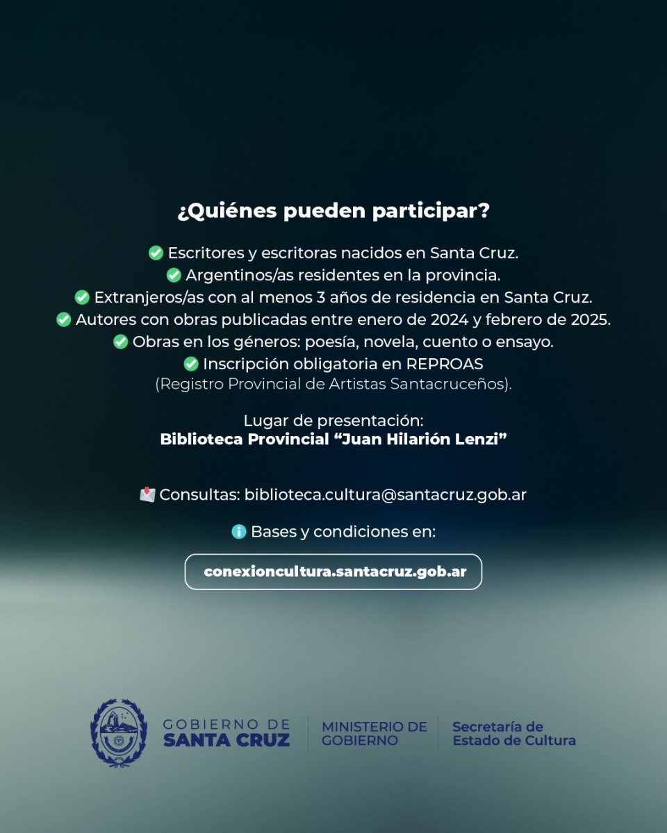 El Gobierno de Santa Cruz, a través de la Secretaría de Estado de Cultura, invita a escritores y escritoras santacruceños/as a postular sus obras para representar a la provincia en la 49° Feria Internacional del Libro de Buenos Aires.
