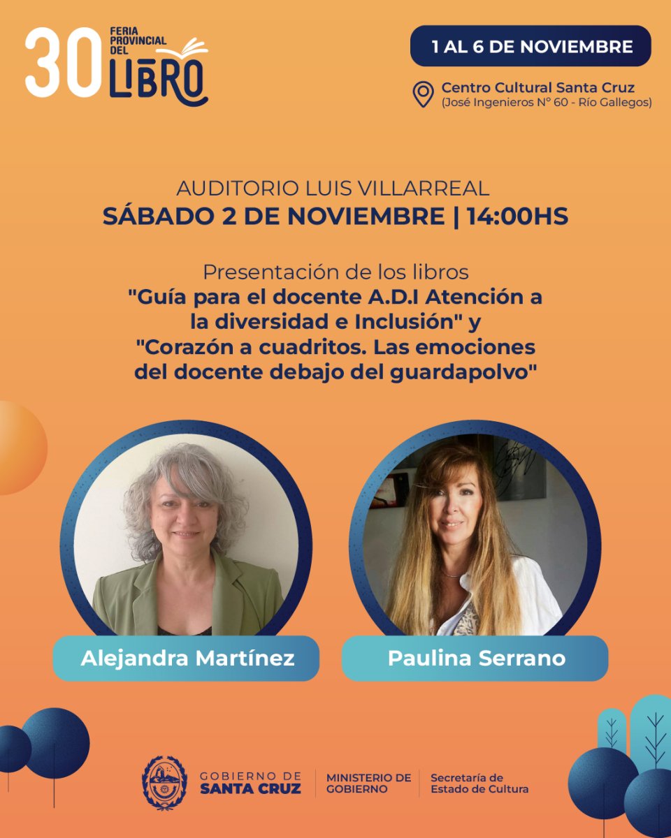 14:00 Alejandra Martínez y Paulina Serrano, docentes de Caleta Olivia, presentarán los libros "Guía para el docente A.D.I Atención a la diversidad e Inclusión" y "Corazón a cuadritos. Las emociones del docente debajo del guardapolvo", publicaciones que brindan herramientas para el abordaje interdisciplinario de la diversidad.