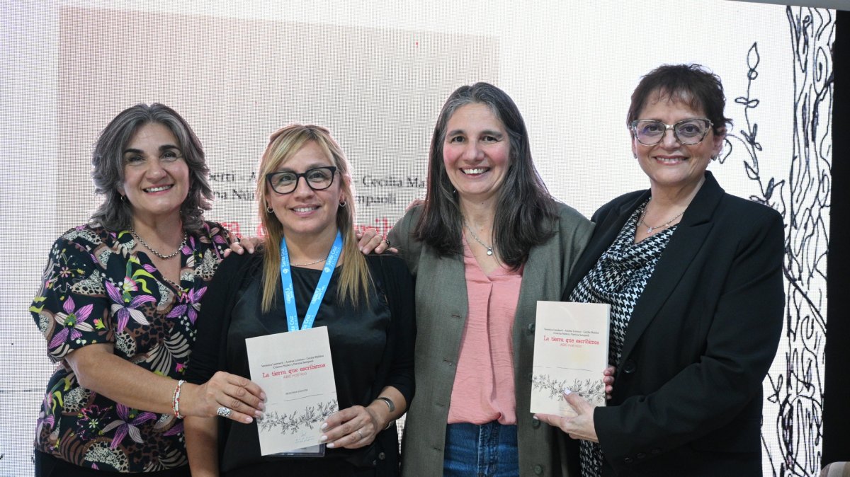 A continuación, llegó el turno de “La tierra que escribimos”, obra presentada por Patricia Sampaoli, Andrea Lorenzo y Verónica Lamberti, pero cuya autoría comparten Cecilia Maldini y Cristina Núñez. Un auditorio atento acompañó la exposición de las autoras, quienes celebraron la posibilidad de compartir su trabajo en este espacio de intercambio literario.