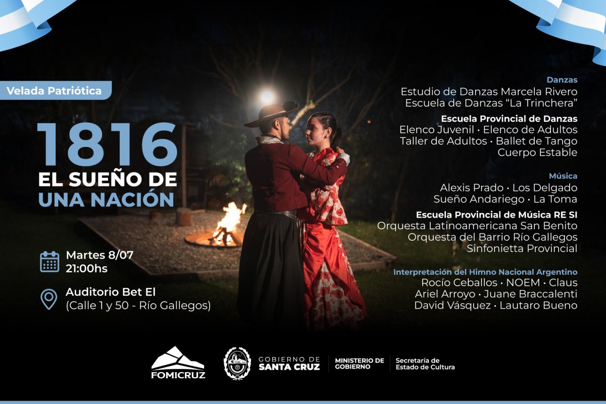 La Velada Patriótica, denominada “1816: El sueño de una Nación”, tendrá una grilla con espectáculos de danzas y música de artistas santacruceños y se podrá seguir desde toda la provincia a través del canal de YouTube de Cultura Santa Cruz, también, por LU14 Radio Provincia y Canal 9 de Santa Cruz.