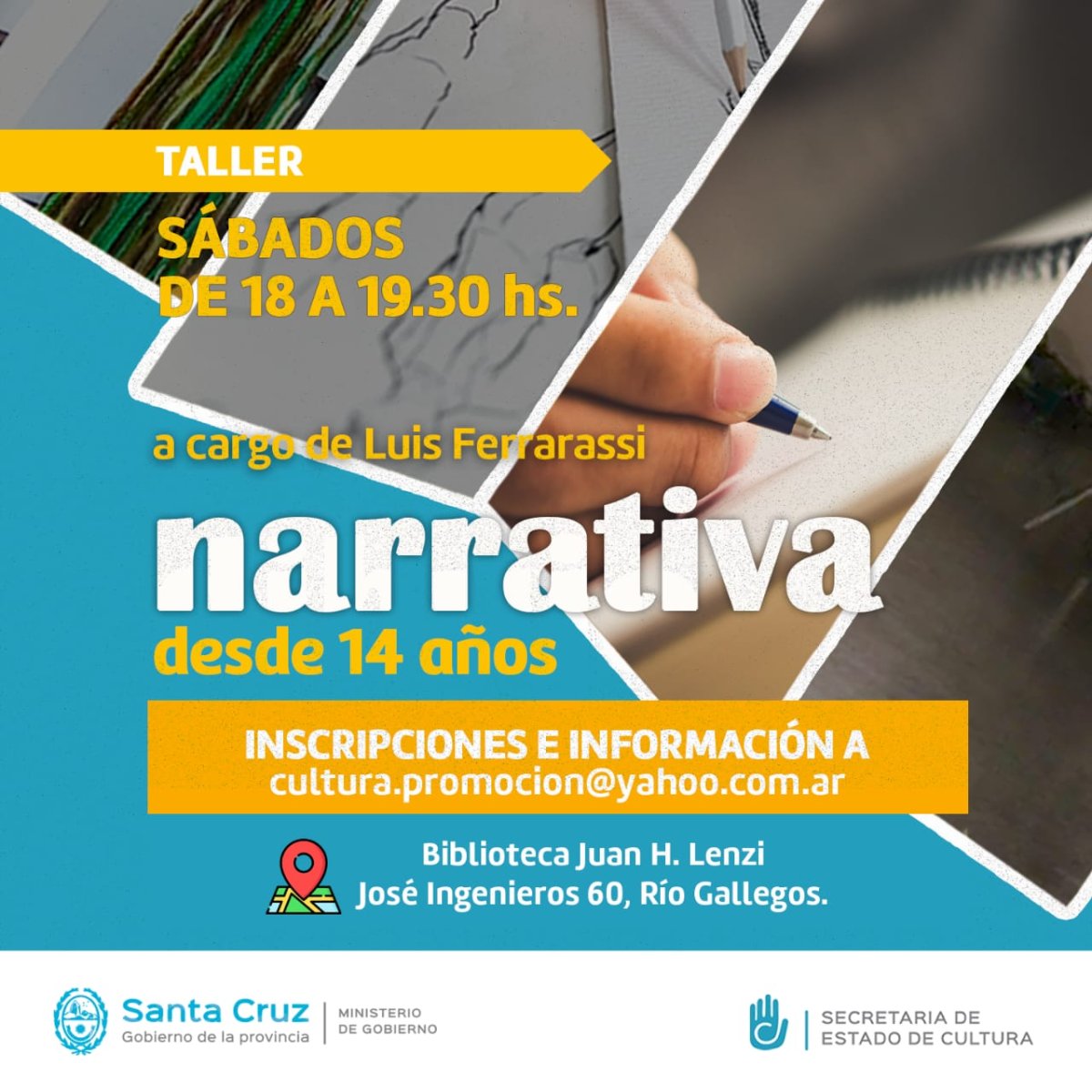 -Narrativa: Estará a cargo de Luis Ferrarassi, destacado escritor santacruceño que ha sido seleccionado en más de una oportunidad para representar a la provincia en la Feria Internacional del Libro. Sus éxitos como “Ruinas del alma”, “Santa Cruz de hielo” y “La tempestad es mañana”, lo han hecho ganar premios locales de escritura y realizar distintos talleres tanto en Santa Cruz como en otras provincias en Ferias del Libro. La clase se realizará los sábados de 18 a 19:30 hs y es a partir de los 14 años.