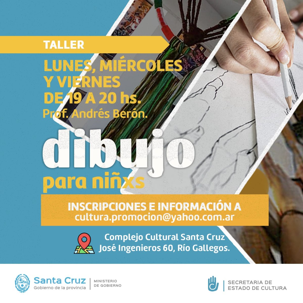 -Dibujo: Dirigido a niños y niñas, la clase será impartida por Andrés Berón, reconocido dibujante y artista local que ha realizado murales y múltiples talleres relacionados con el arte, también es uno de los organizadores de “Cómic Sur”, y en esta oportunidad realizará este taller enfocado en las infancias los lunes, miércoles y viernes de 19 a 20 hs.
