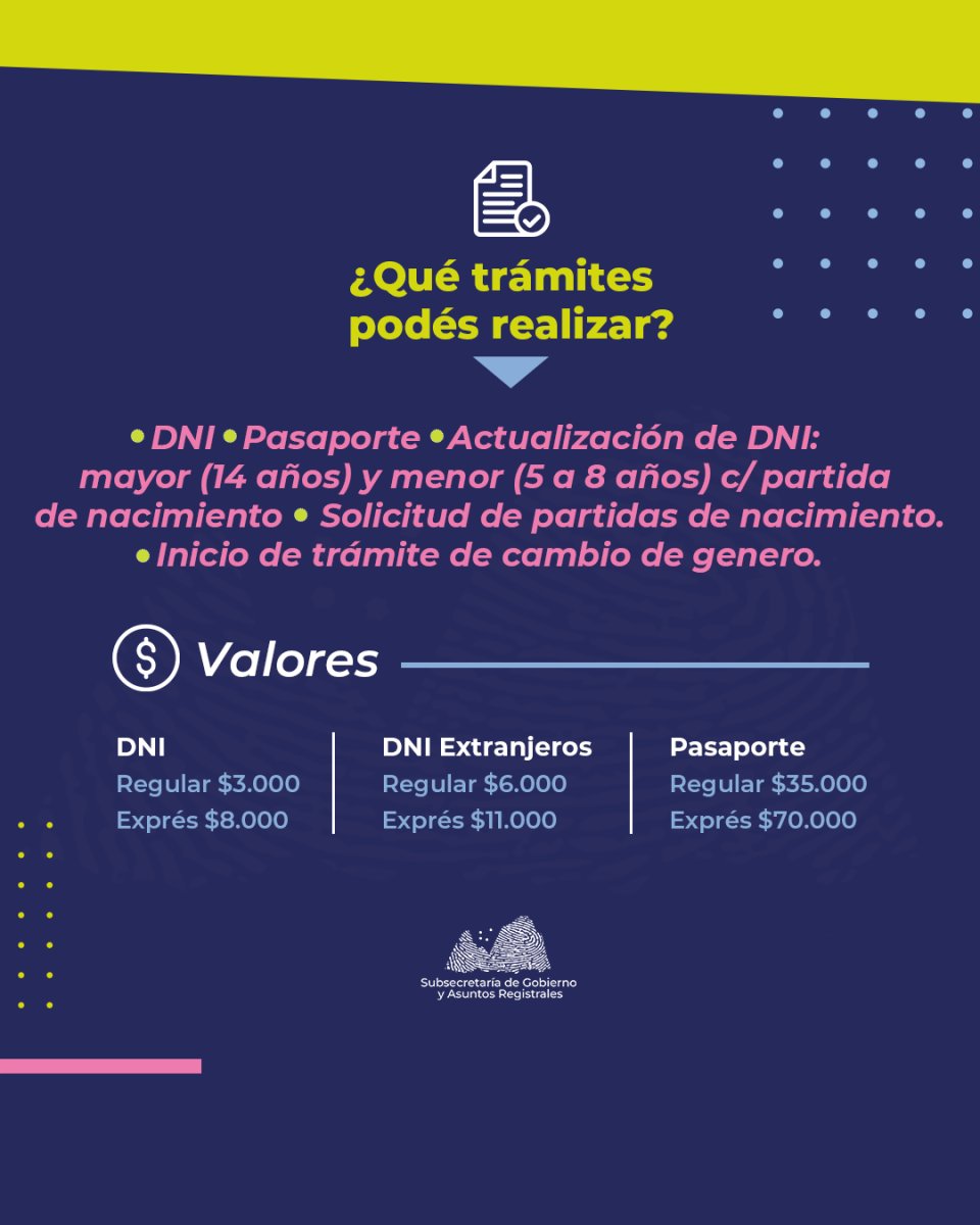 Cabe señalar que, en el lugar, la comunidad tendrá la posibilidad de realizar diferentes trámites tales como DNI, pasaporte, actualizaciones de DNI mayor y menor, solicitud de partida de nacimiento, inicio de trámite cambio de género, entre otros.