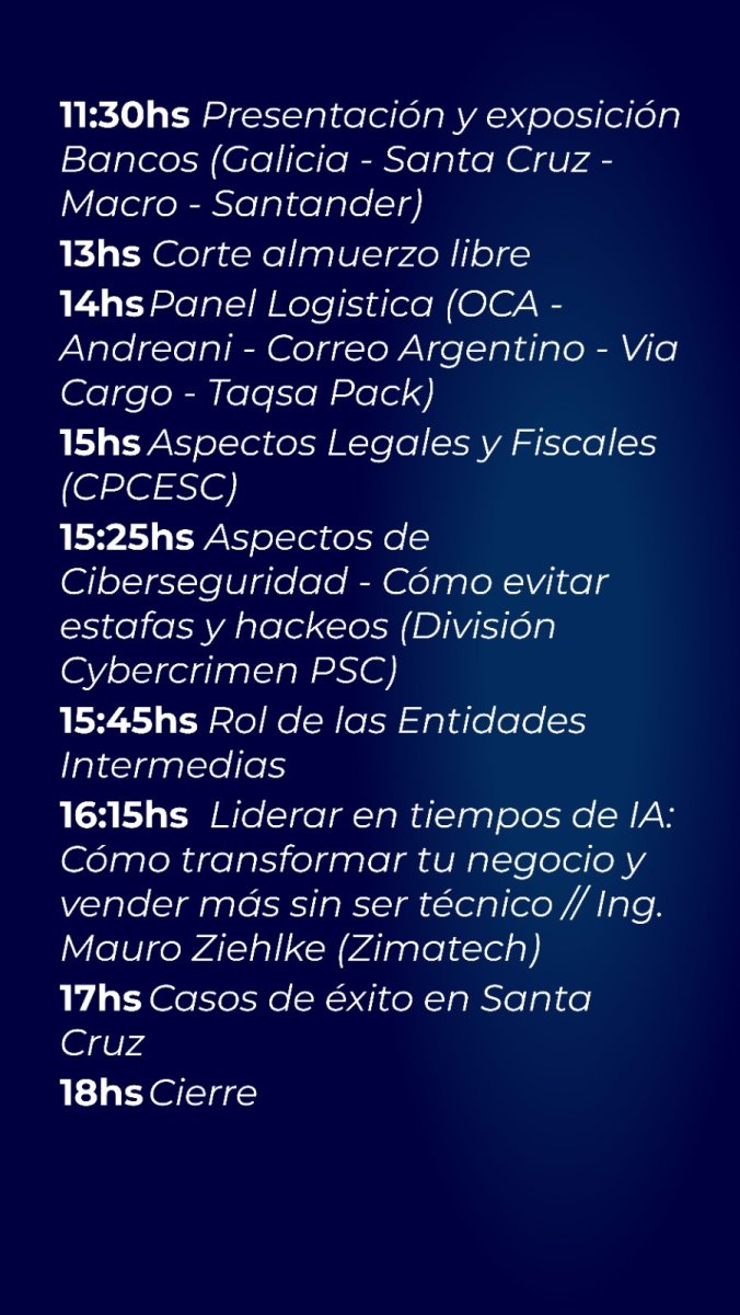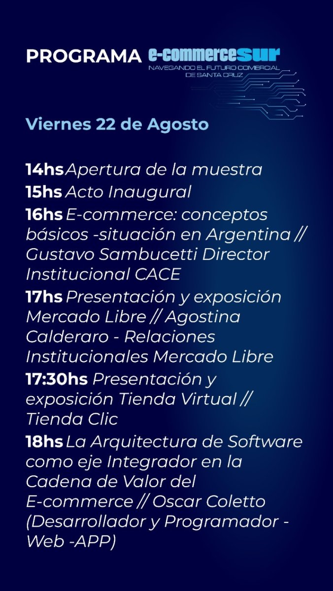 “Se nos ocurrió poder realizar este evento en el cual se puede mostrar todas las cuestiones orientadas a dicha actividad. Entonces, comenzamos este viernes 22 y sábado 23 de agosto este evento denominado e-commerceSUR, navegando el futuro comercial de Santa Cruz, y la idea es acercarle todas las herramientas digitales que necesita un emprendedor o comerciante de la provincia”, señaló.