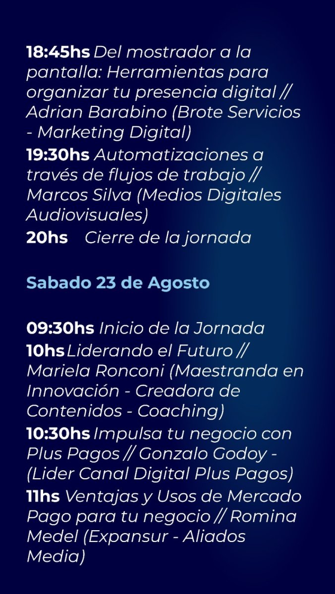 Por último, Paulo Lunzevich adelantó sobre la realización de una segunda edición del evento en Zona Norte, durante el mes de octubre. “Vamos a tener desarrollo local, integración entre los sistemas de venta, sistemas de logística y la venta electrónica; marketing digital e inteligencia artificial tanto para la optimización de tareas como la optimización de ventas. Quiero adelantar también que en el mes de octubre vamos a realizar un segundo evento en la localidad de Caleta Olivia, pero para aquellas personas de cualquier punto de la provincia pueden seguir este primer evento a través del streaming”.