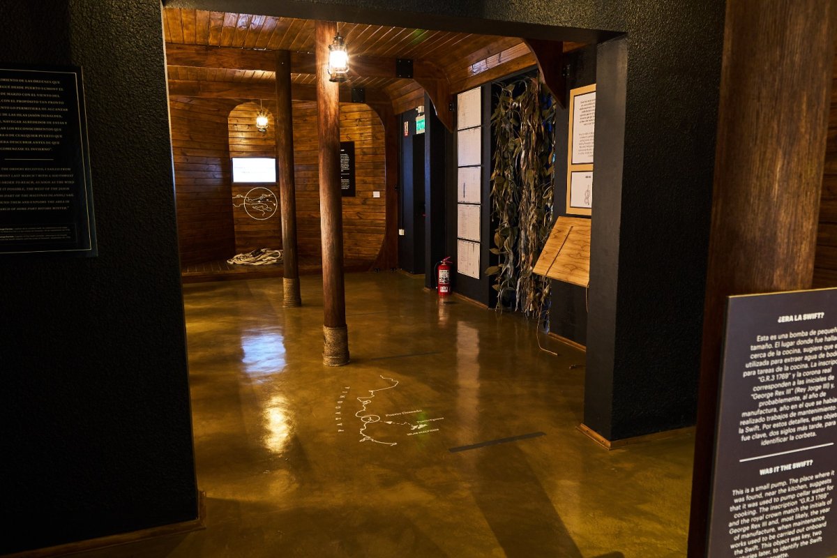 Lo que se exhibe allí es el resultado del rescate de “una corbeta inglesa, en realidad su denominación es sloop de guerra, como no hay traducción al español se le dice corbeta, esta naufraga en aguas de nuestra Ría en 1770, y en 1982 jóvenes de la localidad la encuentran, hacen el rescate de objetos y se crea el museo; por eso este abarca todo lo que es la arqueología subacuática”.