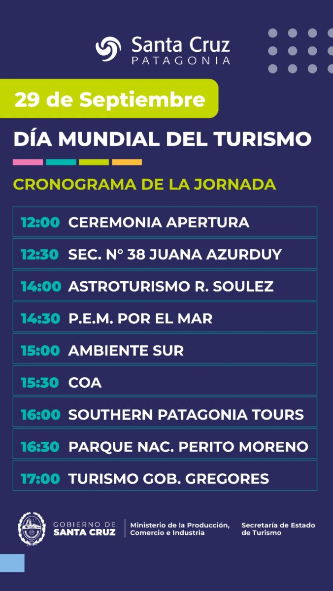 El encuentro se llevará a cabo el lunes 29 de septiembre de 12:00 a 18:00 horas, en la sede de la Secretaría de Estado de Turismo en Río Gallegos, Av. Pres. Dr. Néstor C. Kirchner 863, y contará con un variado programa de actividades destinadas a poner en valor el turismo santacruceño, sus actores y experiencias, bajo el lema “Turismo y Transformación Sostenible”.