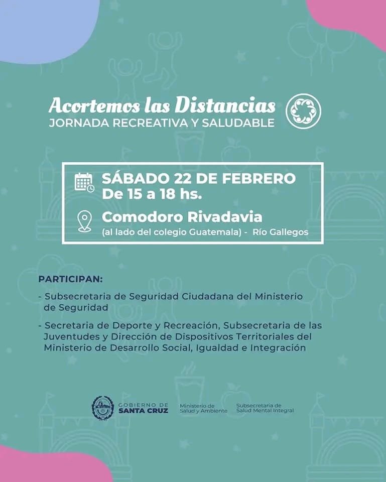 El sábado 22 de febrero de 15 a 18 hs, se llevará adelante una jornada con diferentes propuestas lúdicas, recreativas e informativas para toda la familia, en las afueras del Colegio Guatemala de Río Gallegos.